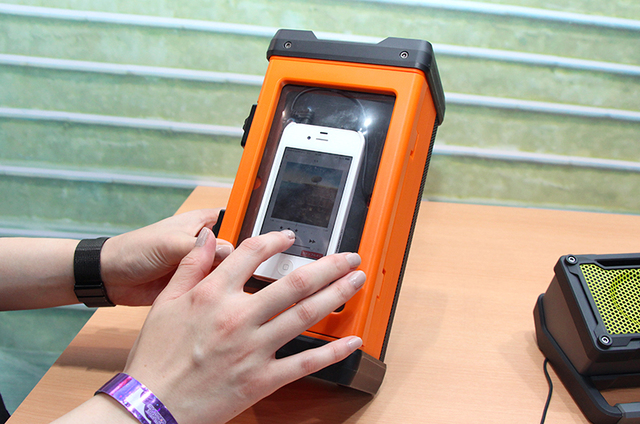 IPX4相当の防水性能を備える「AT-SPB300」は、本体のなかにiPhoneやiPad miniを入れて使える。入れたままタッチ操作も可能。