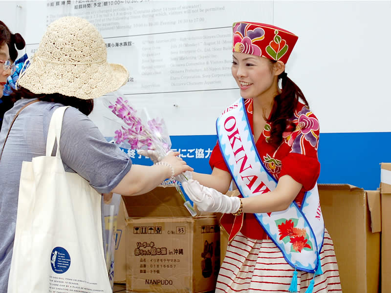 上地さんが来場者へ切り花をプレゼント
