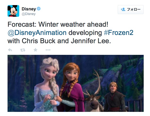 HOME > ニュース > ホビー&カルチャーニュース 監督・プロデューサーは第一作と同じ。オラフも続投。 『アナと雪の女王2』の制作、正式発表 編集部:杉浦 みな子 2015年03月13日 ディズニーのTwitter この写真の記事へ 関連リンク ディズニーのブログ(英文)