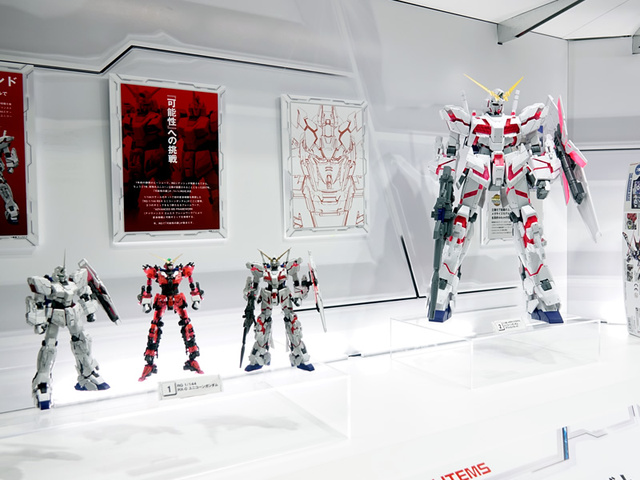 お台場に実物大のものが立つユニコーンガンダムは1/48型という巨大なガンプラが登場予定。左の1/144モデルと比べると大きさがお分かりいただけるだろうか
