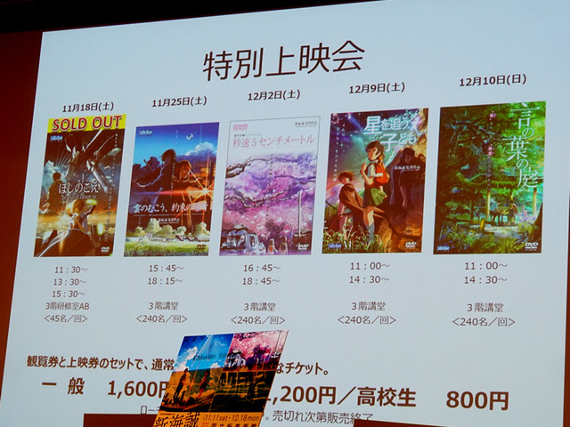 HOME > ニュース > ホビー&カルチャーニュース 国立新美術館で開幕 「君の名は。」の貴重な資料も公開「新海誠展」11日から。監督と神木隆之介さんが見どころを語る 編集部:小野佳希 2017年11月10日 前の写真へ 各作品の特別上映会も 前の写真へ この写真の記事へ 関連リンク 新海誠展「ほしのこえ」から「君の名は。」まで 公式サイト