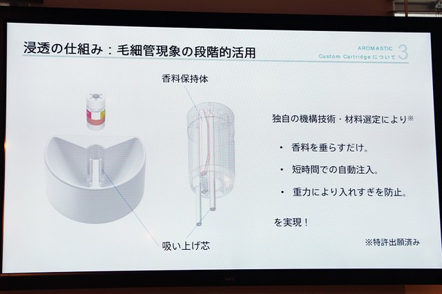 下から吸い上げる力と重力とを組み合わせて、適量をカートリッジに浸透させることを可能にしているという