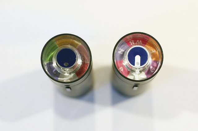 当初はカートリッジが一つだったので色のみの表記(左)、現在は6種類あるため色と英字で香りを表示している(右)
