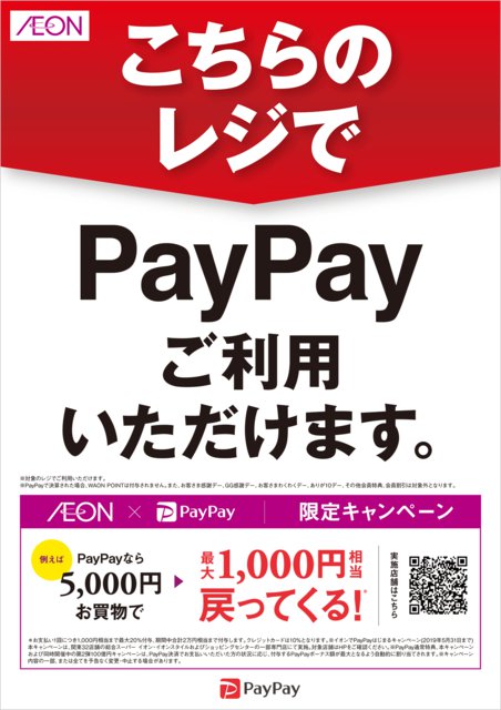 HOME > ニュース > ホビー&カルチャーニュース 「イオンでPayPayはじまるキャンペーン」 PayPay、関東・山梨のイオンで最大20%還元キャンペーン。導入記念で5月31日まで 編集部:平山洸太 2019年04月16日 前の写真へ PayPay対象のレジはこの表示が目印 前の写真へ この写真の記事へ 関連リンク 本件のニュースリリース PayPay
