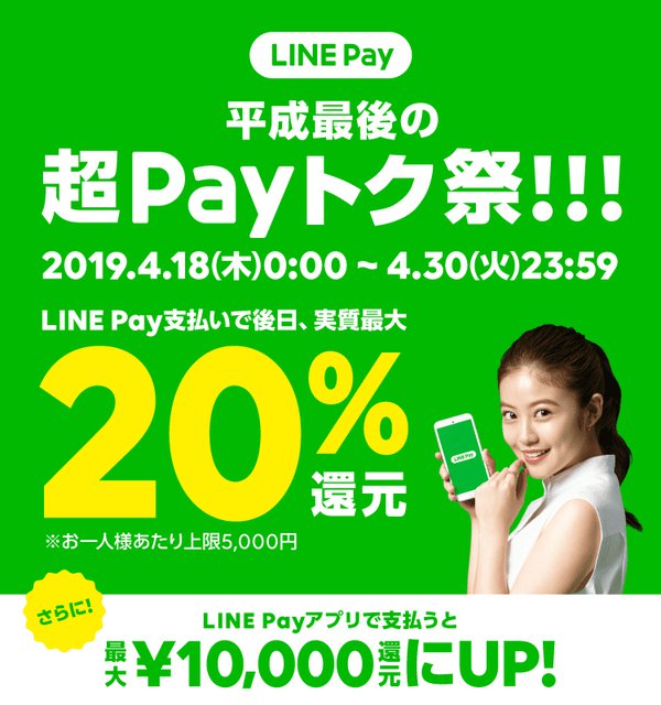 HOME > ニュース > ホビー&カルチャーニュース 店舗マップやクーポン一覧などをアプリに LINE Pay、最大20%還元“平成最後”の超Payトク祭。決済アプリ利用で10,000円還元 編集部:川田菜月 2019年04月17日 次の写真へ 次の写真へ この写真の記事へ 関連リンク 平成最後の超Payトク祭キャンペーン LINE Pay