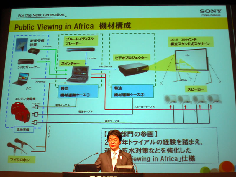 HOME > ニュース > ホビー&カルチャーニュース カメルーン/ガーナでソニー製品を使用してのパブリックビューイングなどを実施 ソニー・JICA・UNDP、南アW杯でHIV防止/啓蒙プロジェクトを実施 - 直販サイトで寄付も可能に ファイル・ウェブ編集部 2010年03月24日 前の写真へ 次の写真へ パブリックビューイング使用機材の構成図 前の写真へ 次の写真へ この写真の記事へ 関連リンク 「Earth F.C.」公式サイト ソニースタイル 特設サイト ドネーションチケット購入ページ プロジェクトの詳細