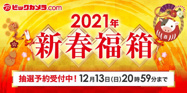 HOME > ニュース > ホビー&カルチャーニュース 1人3商品まで ビックカメラ.com、「2021年 新春福箱」抽選予約受付スタート。12/13 20:59まで ファイルウェブ編集部 2020年12月11日 次の写真へ 次の写真へ この写真の記事へ 関連リンク 「2021年 新春福箱」の詳細