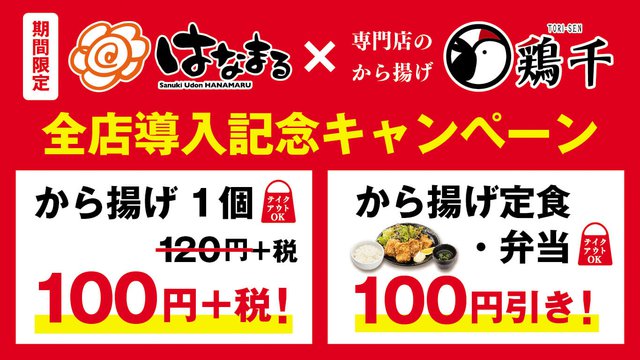HOME > ニュース > ホビー&カルチャーニュース 通常120円が100円に はなまる、鶏千のから揚げを全店舗に導入。記念キャンペーンも実施 PHILE WEB編集部 2021年03月01日 前の写真へ 「鶏千 から揚げ 全店導入記念キャンペーン」 前の写真へ この写真の記事へ 関連リンク 本件のニュースリリース