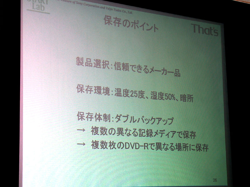 HOME > ニュース > ホビー&カルチャーニュース データを確実に保存する方法を解説 日本写真家協会、写真データの光ディスク保存に関する研究会を開催 Phile-web編集部 2009年02月17日 前の写真へ 次の写真へ 小林氏が語る光ディスク保存のポイント 前の写真へ 次の写真へ この写真の記事へ 関連リンク (社)日本写真家協会 (株)スタート・ラボ