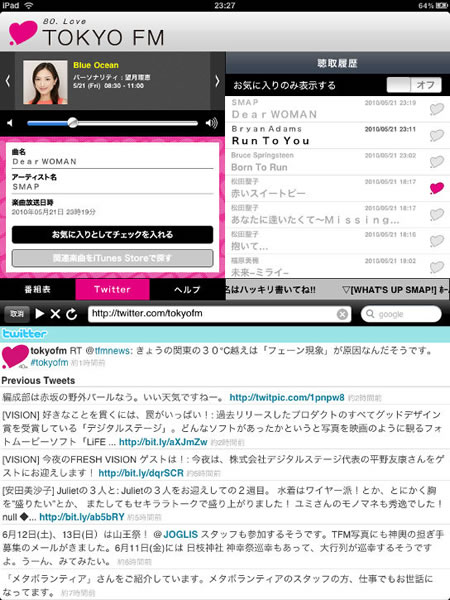 HOME > ニュース > ホビー&カルチャーニュース 一部ユーザー向けに旧バージョンの提供も継続 iPhone/iPod用ラジオアプリ「TOKYO FM」がバージョンアップ - iOS 4対応とiPad画面最適化 ファイル・ウェブ編集部 2010年06月28日 前の写真へ Twitterへのリンクも搭載 前の写真へ この写真の記事へ 関連リンク TOKYO FM 本件の詳細(PDF)