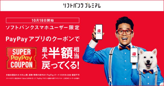 HOME > ニュース > ホビー&カルチャーニュース 超PayPay祭に合わせてクーポン配布 最大半額還元の「スーパーPayPayクーポン」。ソフトバンクユーザー限定で10月18日から 編集部:平山洸太 2021年09月14日 次の写真へ 「スーパーPayPayクーポン」 次の写真へ この写真の記事へ 関連リンク 本件のニュースリリース