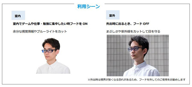 集中力を高めたいときはフードを取り付け、広い視野が必要なときはフードを外して使用