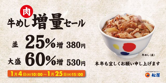 HOME > ニュース > ホビー&カルチャーニュース 1月25日15時まで 松屋、「牛めし」の肉が“最大60%増量”の新春セール。1/4から期間限定 ファイルウェブ編集部 2021年12月27日 「牛めし増量セール」 この写真の記事へ 関連リンク 松屋フーズ