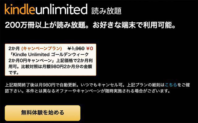 HOME > ニュース > ホビー&カルチャーニュース 2ヶ月99円のオファーも 表示されたら対象!「Kindle Unlimited」が2ヶ月0円。200万冊が読み放題、GW限定 PHILE WEB編集部 2022年05月07日 Amazonでこの画面が表示された方が対象! この写真の記事へ 関連リンク Kindle ゴールデンウィーク2ヶ月0円キャンペーン