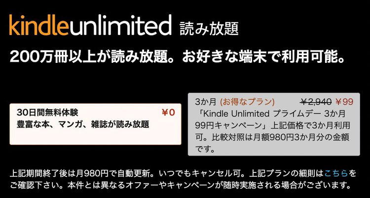 HOME > ニュース > ホビー&カルチャーニュース 200万冊が読み放題になるかも 95%OFFの2ヶ月99円、「Kindle Unlimited」が表示された方のみ特価に PHILE WEB編集部 2022年08月06日 この画面が表示された方だけがキャンペーン対象 この写真の記事へ 関連リンク Kindle Unlimited 2ヶ月99円キャンペーン