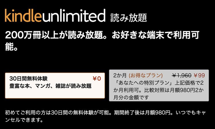 HOME > ニュース > ホビー&カルチャーニュース 通常は1960円 200万冊読み放題で退屈無し!「Kindle Unlimited」が2ヶ月99円の特別プラン PHILE WEB編集部 2022年12月03日 Amazonにこの画面が表示されたらキャンペーンの対象。チェックしてみよう この写真の記事へ 関連リンク Amazon Kindle Unlimitedはこちらから