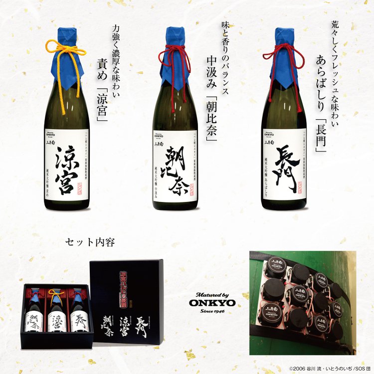 オンキヨー、「ハレ晴レユカイ」を聴かせて熟成させた『涼宮ハルヒ』コラボ日本酒。長門/みくる/ハルヒイメージの3本セット