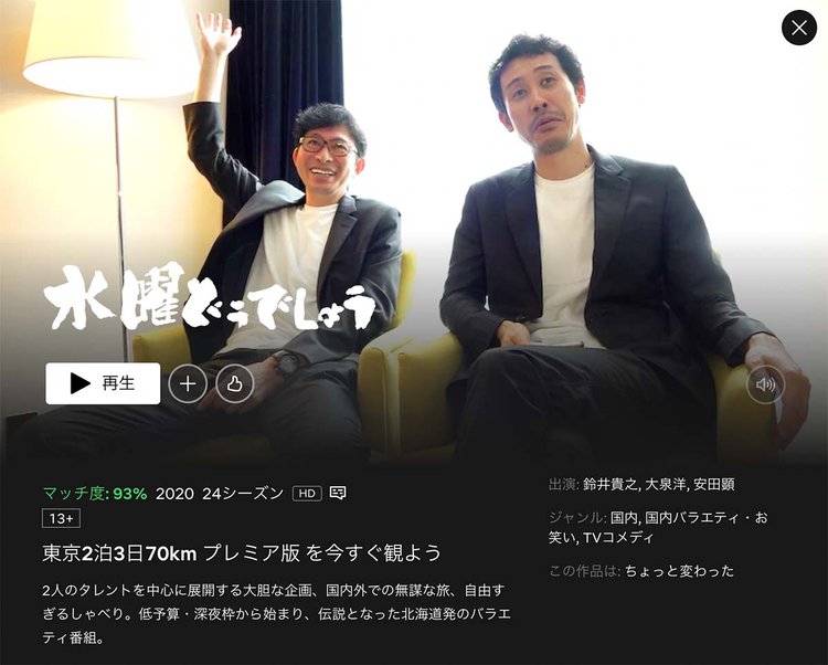 HOME > ニュース > ホビー&カルチャーニュース 東京を歩き回る人気エピソード 大泉洋は番組を降りるのか?水曜どうでしょう「東京2泊3日70km プレミア版」Netflixで本日配信 ファイルウェブ編集部 2023年05月01日 「東京2泊3日70km プレミア版」配信開始(画面はNetflixのもの) この写真の記事へ 関連リンク Netflix
