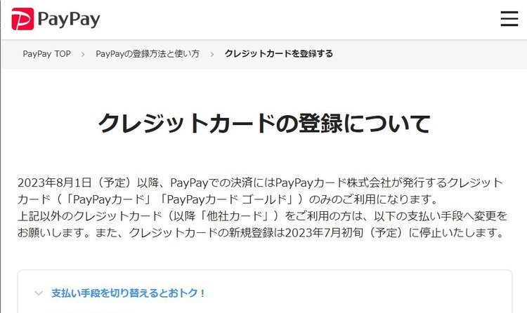 HOME > ニュース > ホビー&カルチャーニュース 7月初旬から登録も停止 PayPay、他社クレジットカードを利用不可に。一部の残高チャージ方法に手数料も 編集部:成藤 正宣 2023年05月01日 8月1日を目処に、PayPayで他社クレジットカードが利用不可に この写真の記事へ 関連リンク クレジットカード利用に関するリリース チャージ手数料に関するリリース クレジットカード登録について PayPay