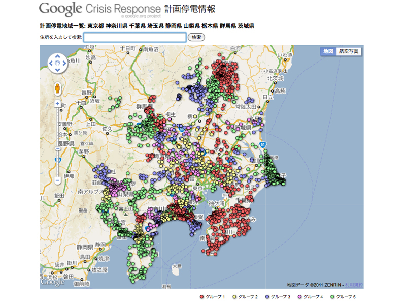 HOME > ニュース > ホビー&カルチャーニュース Googleマップで計画停電の実施グループをチェック可能 − 住所や郵便番号から検索 ファイル・ウェブ編集部 2011年03月16日 この写真の記事へ 関連リンク Googleによる東北地方太平洋沖地震特設サイト