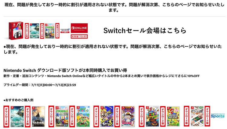HOME > ニュース > ホビー&カルチャーニュース Switchソフト2本同時購入で10%オフに関して Amazonプライムデーで「一時的に割引が適用されない」状態に。Switchソフトセール会場で ファイルウェブ編集部 2023年07月11日 この写真の記事へ 関連リンク 該当のキャンペーンページ