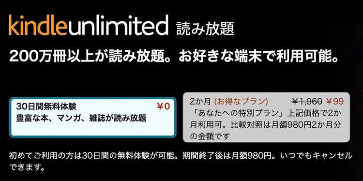 HOME > ニュース > ホビー&カルチャーニュース 200万冊以上が読み放題 Amazonの読み放題が2ヶ月99円。表示されたら対象の「Kindle Unlimited」キャンペーン PHILE WEB編集部 2023年07月16日 この画面が表示されたら2ヶ月99円の対象だ この写真の記事へ 関連リンク Kindle Unlimitedはこちらから