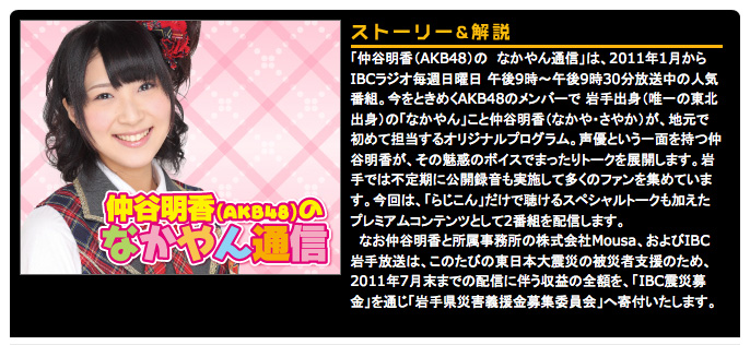 HOME > ニュース > ホビー&カルチャーニュース スペシャルトークを加えたプレミアムコンテンツも TBSラジオの「らじこん」で、IBCラジオ「仲谷明香(AKB48)の なかやん通信」を配信開始 ファイル・ウェブ編集部 2011年04月28日 仲谷明香(AKB48)の なかやん通信 この写真の記事へ 関連リンク 「仲谷明香(AKB48)の なかやん通信」配信ページ らじこん