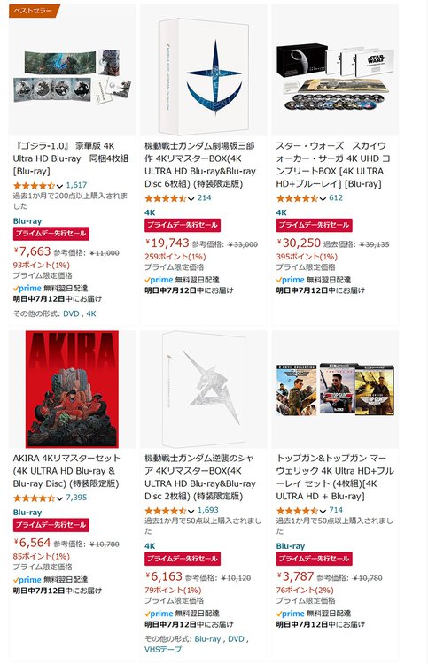 HOME > ニュース > ホビー&カルチャーニュース セールは7月17日まで Amazonプライムデーで4K UHD『ゴジラ-1.0』が早速安い。話題作・名作ディスクが多数お買い得に PHILE WEB編集部 2024年07月11日 前の写真へ 4Kディスクが多数お買い得に 前の写真へ この写真の記事へ 関連リンク Amazonプライムデー「DVD・ブルーレイ セール」