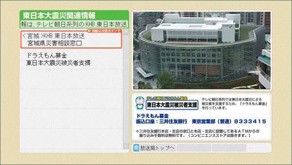 HOME > ニュース > ホビー&カルチャーニュース 東日本大震災の被災者支援の一環として テレビ朝日、被災地の系列局からの情報などを集約した震災関連情報をデータ放送で提供開始 ファイル・ウェブ編集部 2011年06月01日 画面イメージ この写真の記事へ 関連リンク 本件の詳細(PDF)