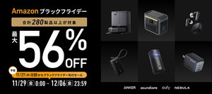 HOME > ニュース > ホビー&カルチャーニュース 本日より先行セールがスタート Amazonブラックフライデー、Ankerの人気製品が最大56%オフに!過去最多の約280製品がセール対象 PHILE WEB編集部 2024年11月27日 次の写真へ オーディオ機器やロボット掃除機がお買い得に 次の写真へ この写真の記事へ 関連リンク Amazon ブラックフライデー 2024 会場はこちら