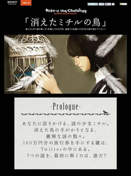 HOME > ニュース > ホビー&カルチャーニュース 7つの謎を解いた先着1名に ソニー、100万円分の旅行券が当たる“nav-u” Twitter連動キャンペーンを実施 ファイル・ウェブ編集部 2011年11月22日 この写真の記事へ 関連リンク キャンペーンサイト nav-u Twitterアカウント Phile-webソニースペシャルサイト「Sony Arcade」