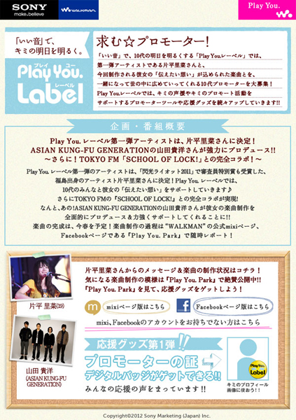 HOME > ニュース > ホビー&カルチャーニュース 第一弾アーティストはアジカン 山田貴洋がプロデュース ソニー、“Walkman”「Play You. レーベル」設立 − SNSで10代のアイデアを募集する参加型プロジェクト ファイル・ウェブ編集部 2012年01月17日 次の写真へ Play You.レーベル 次の写真へ この写真の記事へ 関連リンク Play You. Play You. Label