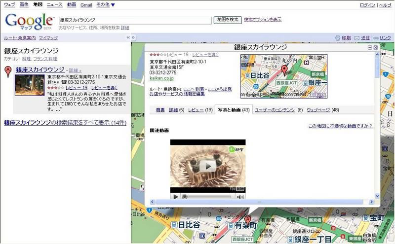 HOME > ニュース > ホビー&カルチャーニュース HD画質への拡大も可能 Googleマップで検索スポットの動画情報閲覧が可能に Phile-web編集部 2009年04月09日 検索結果のイメージ。動画部分をクリックすることでYouTubeへリンクしHD画質での閲覧も可能 この写真の記事へ 関連リンク 本件の詳細(PDF) Google マップ 街ログ