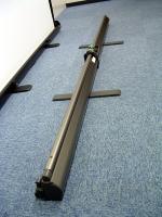 本製品は、引き上げたスクリーンをケースから立ち上げたバー1本で支える方式を採用。4段階で高さの調節が可能だ。スクリーンはフィルムタイプで、ピークゲインは約1.35。画角はともに16対9だ。DVDプレーヤーなどの手前に設置することを想定し、スクリーンの下黒部分は赤外線リモコンの信号が透過するよう工夫が施されている。