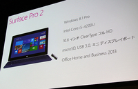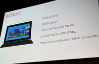 OSはWindows RT 8.1。プロセッサーにはインテルの第四世代Core i5を搭載しており、パフォーマンスを強化。バッテリー持続時間を従来モデルより75%向上したとしている。また、「Microsoft Office Home and Business 2013」をプリインストールしている。