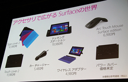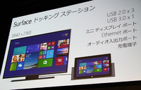 そのほか、使用しないときはフラット形状にできるマウス「Arc touch mouse Surfave edition」(税込6,980円)や、Surface本体と離れた場所(最大9m)でBluetoothキーボードを使えるワイヤレスアダプター(税込4,980円)、SurfaceをマウントしてデスクトップPCのように使えるドッキングステーション(税込19,980円)も用意される。ドッキングステーションは有線LAN端子や外部モニター接続端子を備えている。
