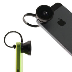 スマートフォンやフィーチャーフォンのカメラ部分に挟みこんで使用できる魚眼レンズアダプター。本体サイズはφ29mm×20mmで、質量は約23g。製品にはポーチとクロスが付属する。