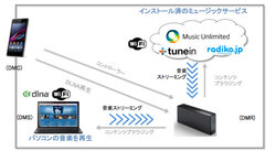 Wi-Fi再生機能搭載により、ルーター経由でiPhone/iPadの音源をAirPlayにてよりワイヤレス再生が可能。また、DLNA機能により自宅PCやホームサーバーなどに保存されている音楽ファイルにワイヤレスでアクセスし音楽再生が行える。くわえてBluetoothでのワイヤレス再生にも対応している。
