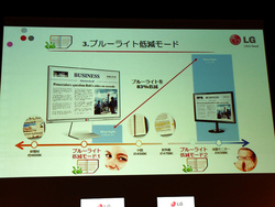 なお、ブルーライト低減モードでは、新聞のような色味の「低減モード1」と、少し黄色みがかった「低減モード2」という2種類を選択可能。「ブルーライト低減モードでは色温度が下がり、画面の色味が多少黄色みがかって輝度も下がる。色判別が重要な仕事などには一部向かない点もあるが、一般的な文書作成やウェブの閲覧ではまったく問題ない。これで眼精疲労を低減できる非常に有効な機能だと思っている」(同社コンシューマエレクトロニクス セールスチーム次長 道山涼司氏)という。