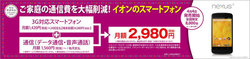 端末は「nexus 4」で、全国8,000台限定。日本通信との協業により、通信サービスにはb-mobileを利用。端末代金が月額1,420 円(税抜)×24回払いの総額34,080円(税抜)、通信サービス料金は月額1,560円(税抜)から利用できる。