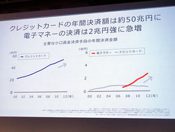 そして「au WALLET」について、クレジットカードの年間決済額が約50兆円に、電子マネーの決済が2兆円強に成長しているデータを紹介。「現金決済よりもポイントが貯まる決済手段を好むようになっていたり、消費増税で小銭がたまるのを嫌う消費者が増えたりしている」とし、クレジットカードや電子マネーが今後も大きく伸びる可能性を持っていると説明する。