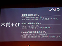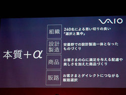 こうした考えの下、「本質+α」というキーコンセプトを発表。パソコンに本当に必要とされる機能や性能という本質を追究して余計なものを削ぎ落としていくことがかえって“+α”の発見につながるという考えを示し、「本質のなかから尖った+αを見つけ出すことで、本当のVAIOの姿につながると信じている」と語った。