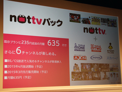 なお、本日の発表会ではNOTTVについて、「フジテレビONE」や「スカパー!」などBS/CS放送で人気の6チャンネルを追加予定であることもアナウンスされた(関連ニュース)。既存プランに235円を追加した月額635円(税抜)で、新しい6チャンネルを含めた全番組を視聴できるプラン「NOTTVパック」を、2015年4月から提供開始する予定としている。同年3月から先行販売するとのこと。