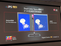 デュアルカラースペース機能を搭載し、1画面上で同時に2つの色域設定による映像を左右に同時に出力可能。これにより例えば、印刷向けの色合いとウェブ向けの色合いなど、異なる色合いで表示される画像を同時にひとつの画面で比較できる。同機能はsRGB/AdobeRGB/キャリブレーションした結果を保存したプリセットのピクチャーモードで利用できる。