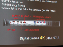 画面サイズは前述のように31インチで、輝度は320カンデラ、最大コントラスト比が500万対1(通常1,000対1)、視野角は水平垂直とも178度。端子類はver.1.4のHDMIを2系統、ディスプレイポートとミニディスプレイポートを1系統ずつ装備。ディスプレイポートのみ60pに対応している。USBは3.0で、UPを1系統、Downを3系統備えている。スタンド込みの質量は約9.6kg。HDMIを60p非対応とした点については「あくまでPCモニターが主眼であり、PCではHDMIでの60p出力がまだ少ないための判断」(同社スタッフ)だとのことだった。