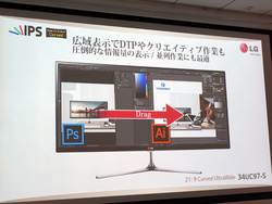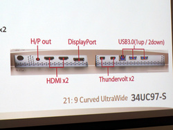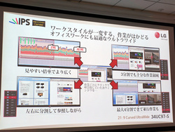 「34UC97-S」は、国内初となる34インチの曲面型21対9モニター。解像度は3,440×1,440。シネスコサイズの横長画面やIPSパネル、そして狭額ベゼルによって映像への没入感を高めたとしている。なお、カーブ具合は「数値は非公開だが人間工学に基づいた研究の上で決定した」(同社スタッフ)という。
