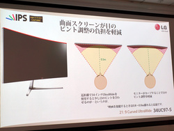 森氏は、「今までずっと平面モニターをやってきて、34インチも出していたが、『画面の端を見るときにピント合わせが大変』という声ももらっていた」と、曲面ディスプレイ開発の意図を説明。