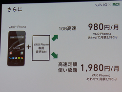 日本通信では、端末との同時申し込みでないと購入できないVAIO Phone専用SIMを用意。上記のように通信料金と端末本体代金をセットにした分割支払いプランを用意しており、音声通話がセットになった月額1,980円の定額接続し放題プラン、もしくは月額980円の1GB通信プランが利用できる。なお、VAIO専用SIMと銘打っているが、もちろん他社MVNOでのSIMでも端末を利用可能。また、VAIO専用SIMを他社製端末に挿して利用することもできる。