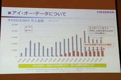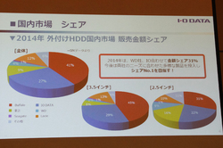 プレゼンでは、外付けハードディスクの国内市場についても言及。アイ・オー・データは2014年、ハードディスクとNAS合わせて約178億円を売上げた。ハードディスクはエコポイント終了以降、ここ3年において売上高は横ばいだが、NASは微増ながら伸長しているという。2014年の外付けハードディスク国内市場販売金額シェアは、アイ・オー・データが27%で、WD社が4%とのこと。土田氏は「2社合計で31%と、1位のバッファローの41%にはまだ届かない。しかし、今後は両社がユーザーニーズに合わせた多様な製品を投入することで販売金額シェア一位を目指す」と意気込みを語っていた。