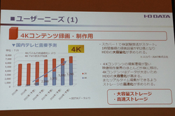 土田氏は、ハードディスクの売上高の伸長は横ばいながら、ストレージへのユーザーニーズは今後伸びていくと指摘。これまでは「パソコンデータのバックアップ用」と「テレビ録画用」が主なニーズであったが、ここに「4Kコンテンツ録画・制作用」「パーソナルコンテンツの保存用」「企業データの保全用」という用途が加わっていくとした。